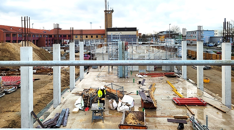 Neubau der Feuer- und Rettungswache mit Sporthalle zweigeschossigem Parkdeck über dem Werkstattbereich Zwei gegenüber angeordnete ca. 160 m lange 4-geschossige Riegel – verbunden durch drei 1- bis 4-geschossige Baukörper Ortbeton-Skelettbauweise mit unterzugsfreien Stahlbeton-Flachdecken in den Obergeschossen Abfangung der Obergeschosse über den Fahrzeughallen mit Unterzugs-Systemen und wandartigen Stahlbeton-Scheiben Verglaste Stahl-Verbindungsbrücken zwischen Mittel- / Ost-Riegel und Süd-Riegel |