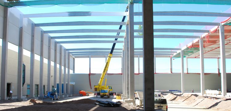 Anbau eines ca. 20 m hohen Hochregallagers an die vorh. Logistikhalle mit ca. 12.500m² Grundfläche Räumliches Stb.-Fertigteil-Tragwerk mit in Köcherfundamenten einge- spannten Stb.-Fertigteil-Stützen Grundraster 18 m x 23 m | |